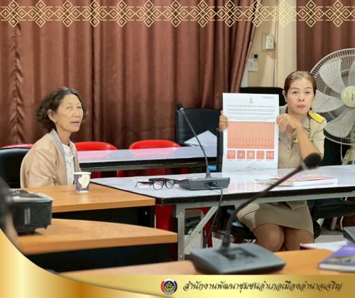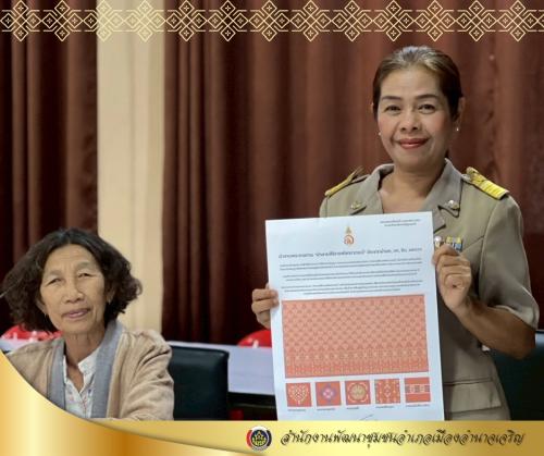 นางอัมพวัน แสงทอง พัฒนาการอำเภอเมืองอำนาจเจริญ พร้อมด้วย นางรัตนาภรณ์ พิมพ์หล่อ นักวิชาการพัฒนาชุมชนปฏิบัติการ ดำเนินการประชุมสร้างการรับรู้ภูมิปัญญาไทยและผ้าลายพระราชทาน “ผ้าลายสิริราชพัสตราภรณ์” ให้แก่ตัวแทนผู้ผลิต ผู้ประกอบการ OTOP กลุ่มทอผ้าในพื้นที่อำเภอเมืองอำนาจเจริญ เพื่อเป็นต้นแบบและพัฒนาต่อยอดเพิ่มมูลค่าให้ผลิตภัณฑ์ผ้าพื้นถิ่นและงานหัตถกรรมต่อไป